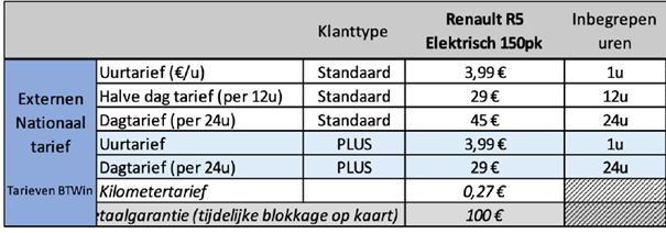 De bevestigingsmail die bij elke reservatie wordt verzonden, dient tot vaststelling van het toegepaste tarief. De kosten voor het opladen van de batterij zijn inbegrepen in de huurprijs.